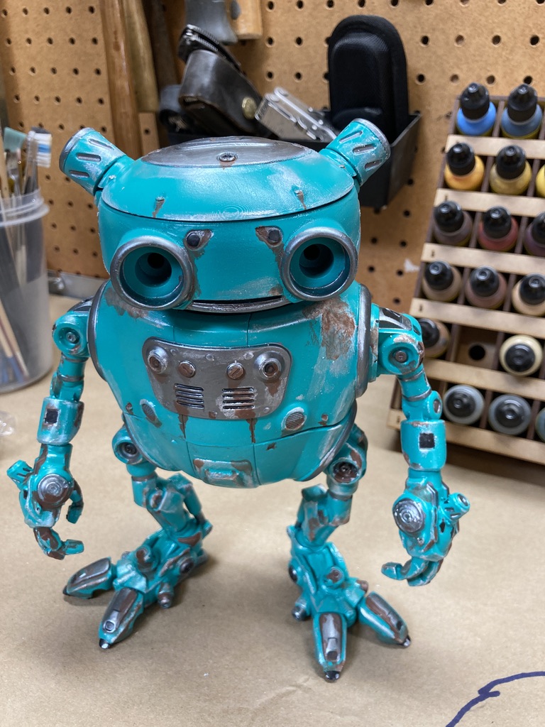Some months ago, I ran across a robot that I thought looked cool that would be fun to paint. The name of the artist is Paul Braddock. Initially I found him here. But, it’s a resin model that isn’t available and costs $170 for the model, which was more than I was likely to spend. Instead, I purchased and purchased the .stl files for the model which would allow me to print my own robot AND HAVE MY WAY WITH HIM!