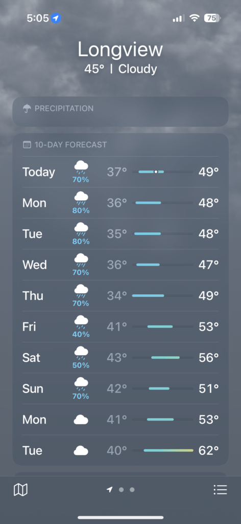 The weather app I use keeps taunting me, holding a day or three of 60+ degree estimates out at the end of its 10-day forecast. I get excited, but inevitably, those 60 degree days turn back in to mid- to low-50s and rain.